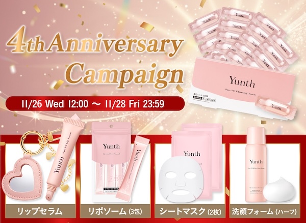 Yunth(ユンス)は、生VCシリーズを中心に人気のスキンケアブランドで、定期的に内容が変わるキャンペーンセットが用意されています。
