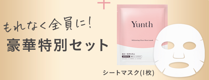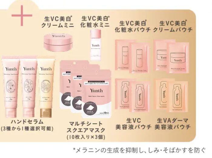 - Yunth(ユンス)の生VC美白美容液(1箱)は入っているので、プラスαの豪華商品特典が気に入ったら購入がおすすめ